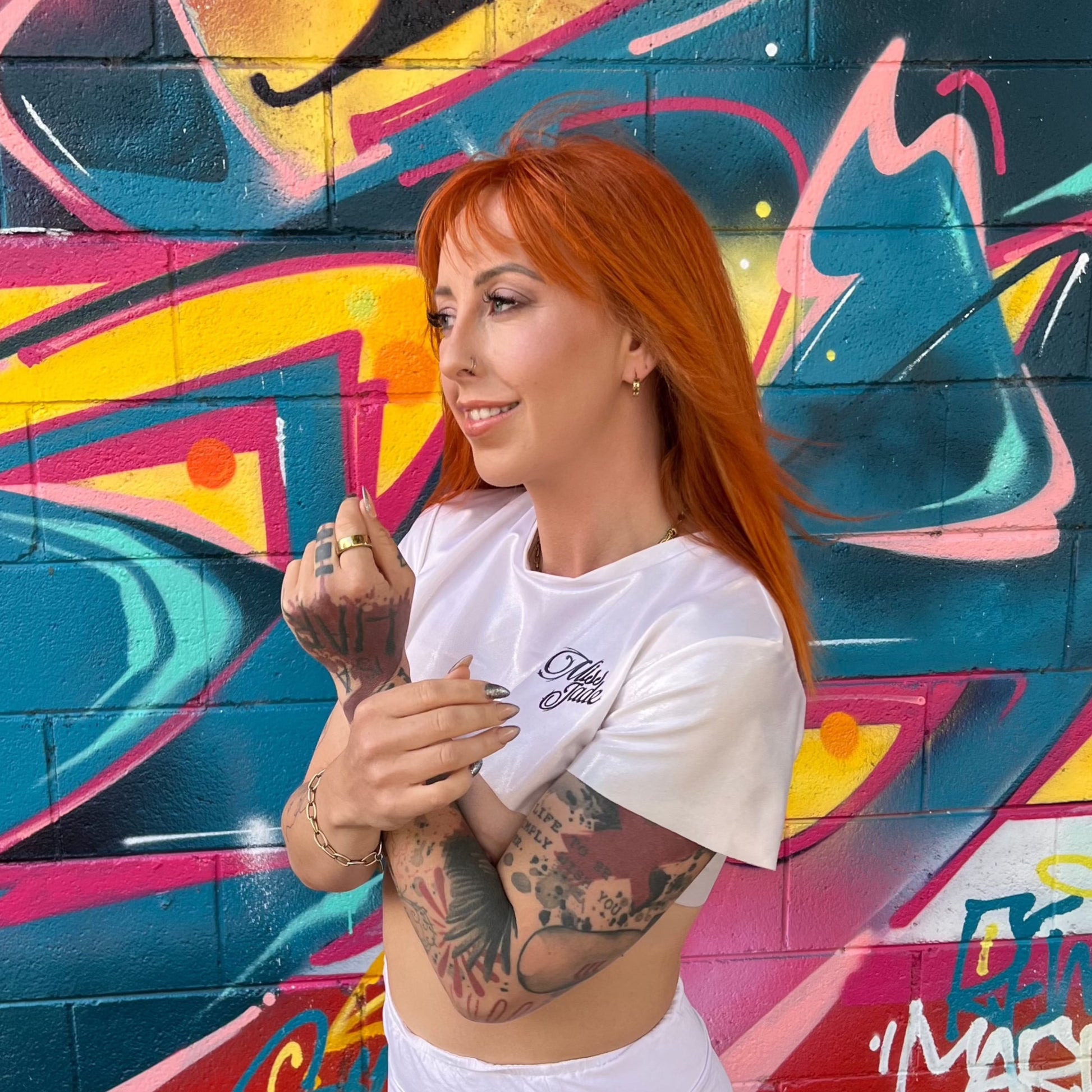 Limited Edition cropped shimmer tee with Miss Jade logo.